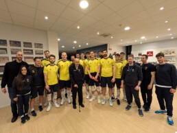 Brindisi e foto di gruppo per Vezzani, che proprio oggi festeggia i suoi 95 anni e che rappresenta l’ultimo pilastro vivente della Minelli Modena con cui ha conquistato tre storici titoli tricolori tra il 1953 e il 1955, pagine indelebili della storia sportiva gialloblù.