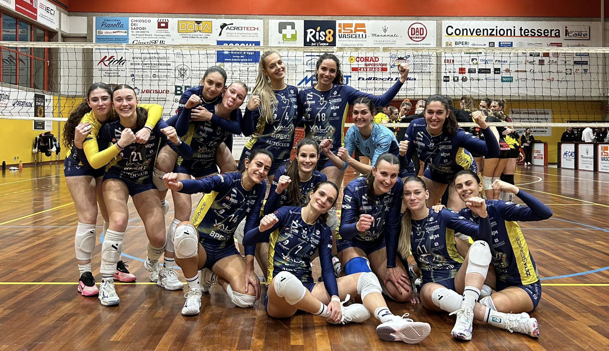 Vittoria al tie-break contro Cavriago al termine di una partita combattutissima e primo posto in classifica a quota 46 punti nel girone E del campionato di Serie B2. E’ stato un sabato perfetto per la squadra femminile di coach Ivan Tamburello, capace di battere un avversario tosto con una prestazione di grande cuore e determinazione: spiccano i 21 punti realizzati da Adani, oltre ai 10 di Corsi. Con Cavriago è arrivata la 16esima vittoria stagionale (l’ottava consecutiva) in 17 partite disputate, un percorso quasi perfetto in attesa dei prossimi impegni. Le ragazze gialloblù torneranno in campo sabato 7 marzo (ore 20.30) al PalaPanini contro Certosa Volley Pavia.
