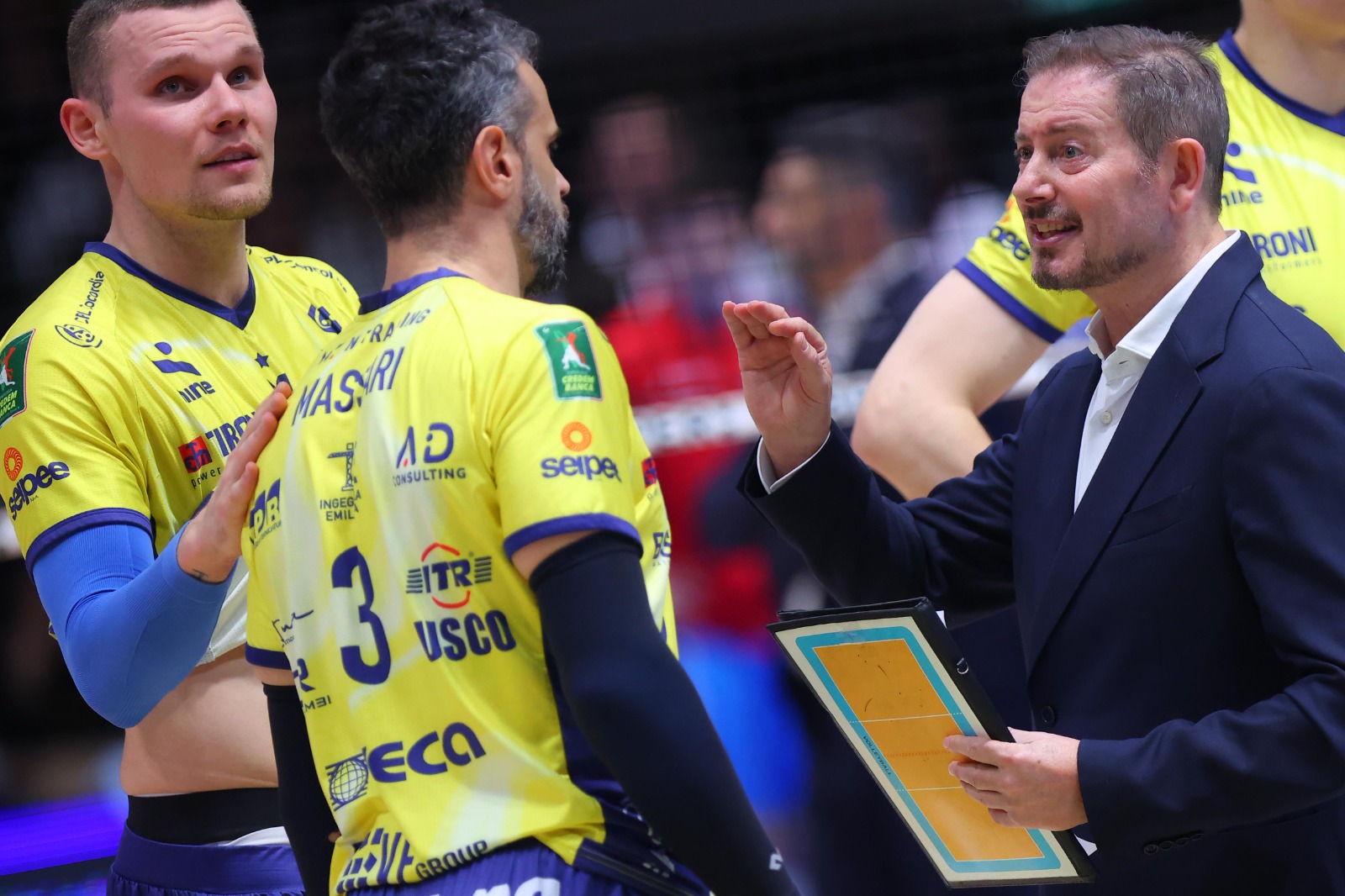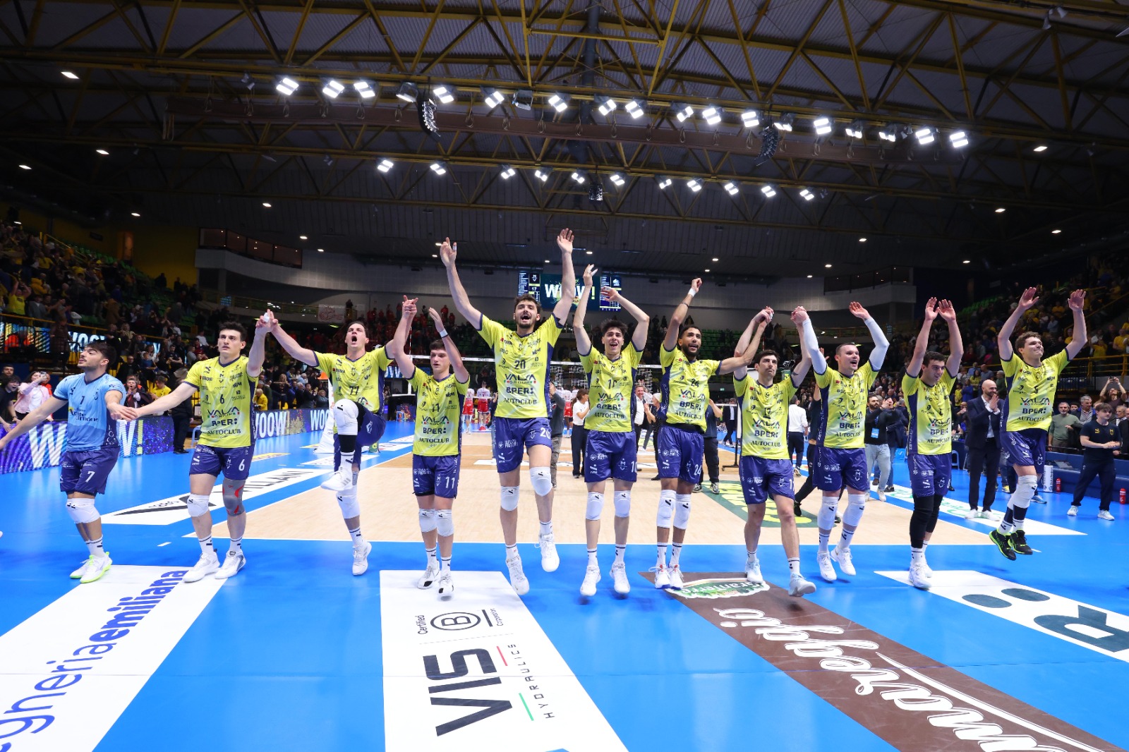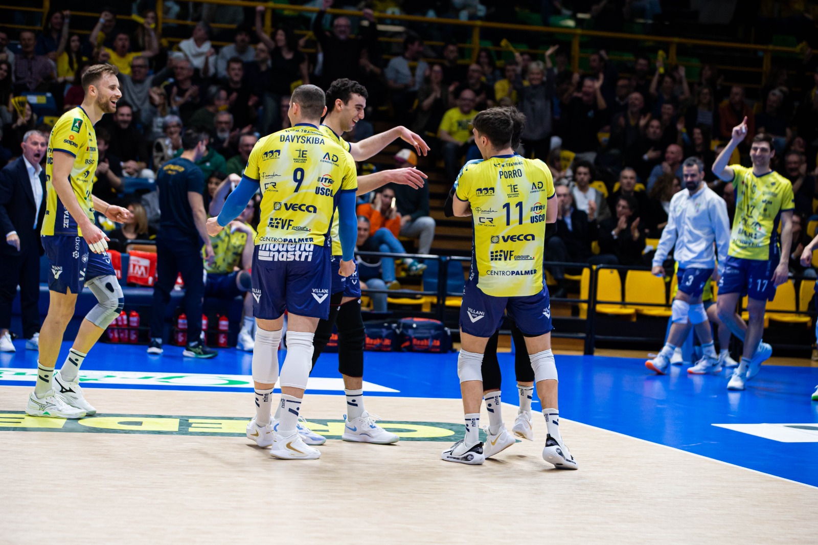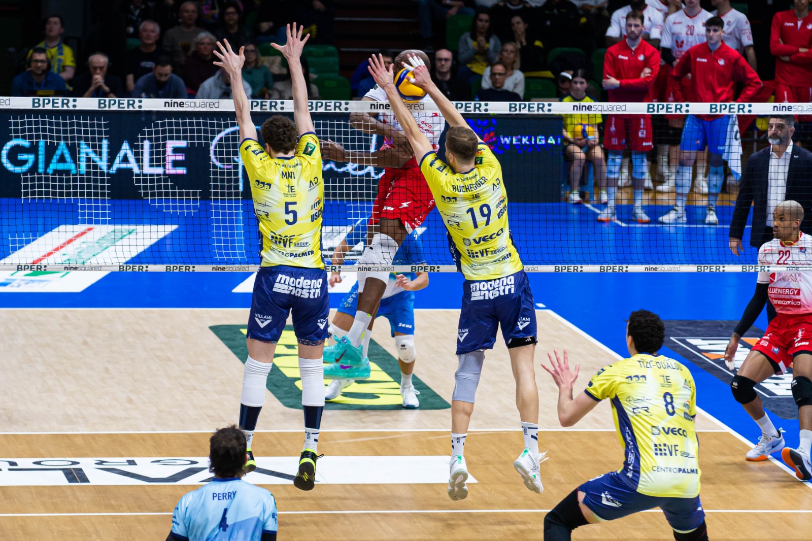 Modena parte con il sestetto composto da Tizi-Oualou-Buchegger in diagonale principale, Davyskiba-Luca Porro di banda, Sanguinetti-Mati al centro con Perry libero. Piacenza risponde con Paolo Porro al palleggio, Bovolenta opposto, Mandiraci-Gutierrez martelli, Simon-Comparoni centrali con Pace libero. La formazione ospite parte meglio, muro di Simon su Davyskiba e 5-8 con timeout Giuliani. I gialloblù ritrovano la parità, ace di Buchegger e 13-13. Si prosegue punto a punto in un PalaPanini infuocato, pallonetto vincente di Porro e 20-19. In un finale di parziale combattutissimo, è Piacenza ad avere la meglio: muro di Gutierrez su Buchegger per il 23-25 e 0-1. Modena reagisce subito in avvio di secondo set, muro di Sanguinetti e 5-1 dopo i primi scambi. I padroni di casa non mollano di un centimetro, primo tempo di uno scatenato Sanguinetti e 18-16. Piacenza alza la voce e risponde colpo su colpo conquistando anche il secondo parziale, 22-25 con errore di Davyskiba in battuta e 0-2. Prevale l’equilibrio in avvio di terzo parziale, Mati a segno e gialloblù avanti 8-7. Modena mantiene il proprio vantaggio, muro di Porro su Bovolenta e 19-16. La compagine di Giuliani, trascinata da un super Porro e dal punto finale di Davyskiba, riapre il match: 25-20 e 1-2. Modena continua a spingere, pipe di Porro e 6-5 dopo i primi scambi. I gialloblù insistono con la spinta del PalaPanini, muro di Tizi-Oualou su Mandiraci e 14-9. Il vantaggio aumenta ulteriormente con il muro di Porro su Bovolenta, 19-13. Uno strepitoso Buchegger in battuta e il sigillo finale di Tizi-Oualou regalano anche il quarto set ai padroni di casa, 25-16 e 2-2. Nel quinto e decisivo parziale, Modena vince 17-15 e conquista gara 1: sabato alle ore 18 a Piacenza gara 2.
