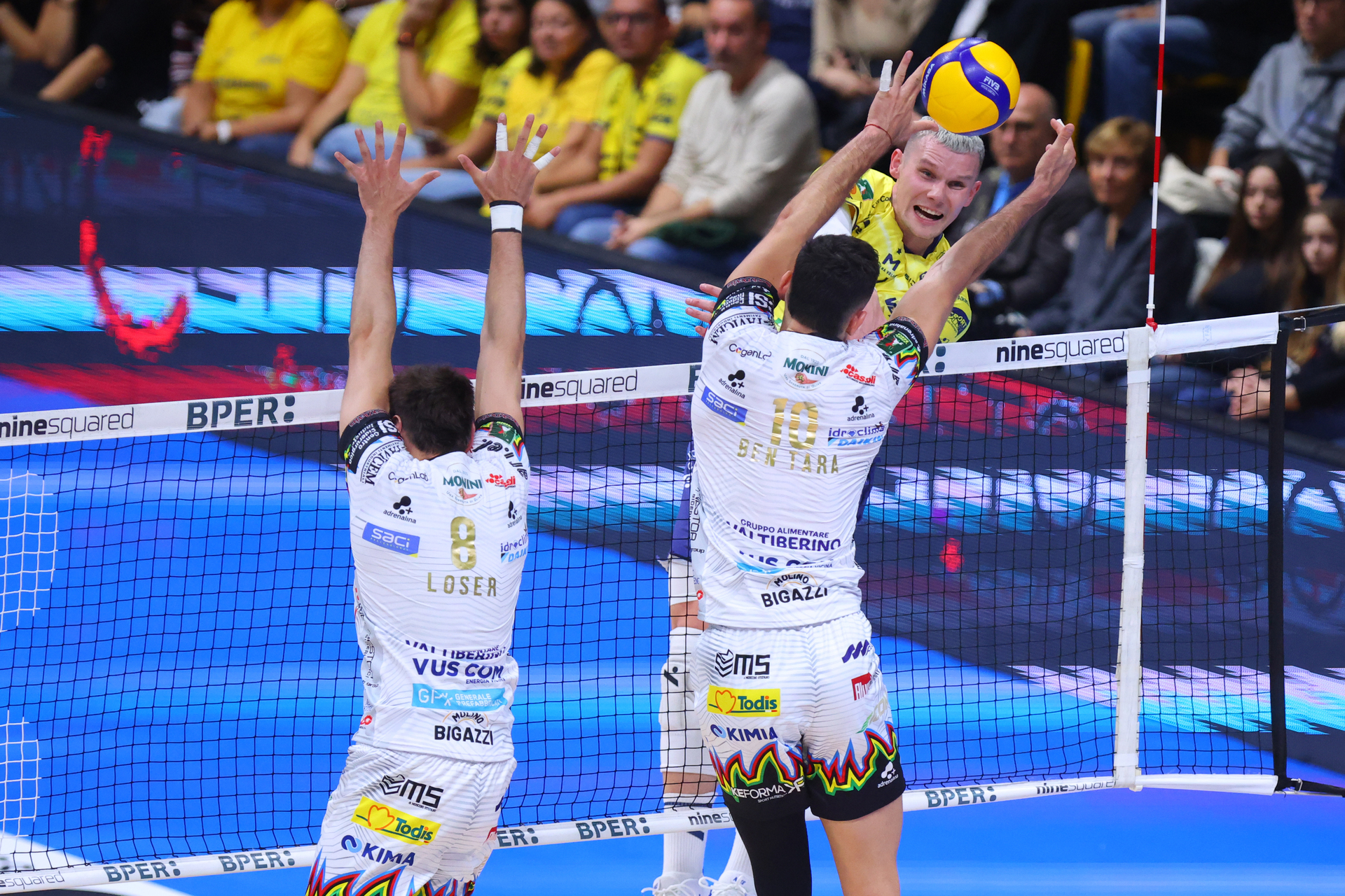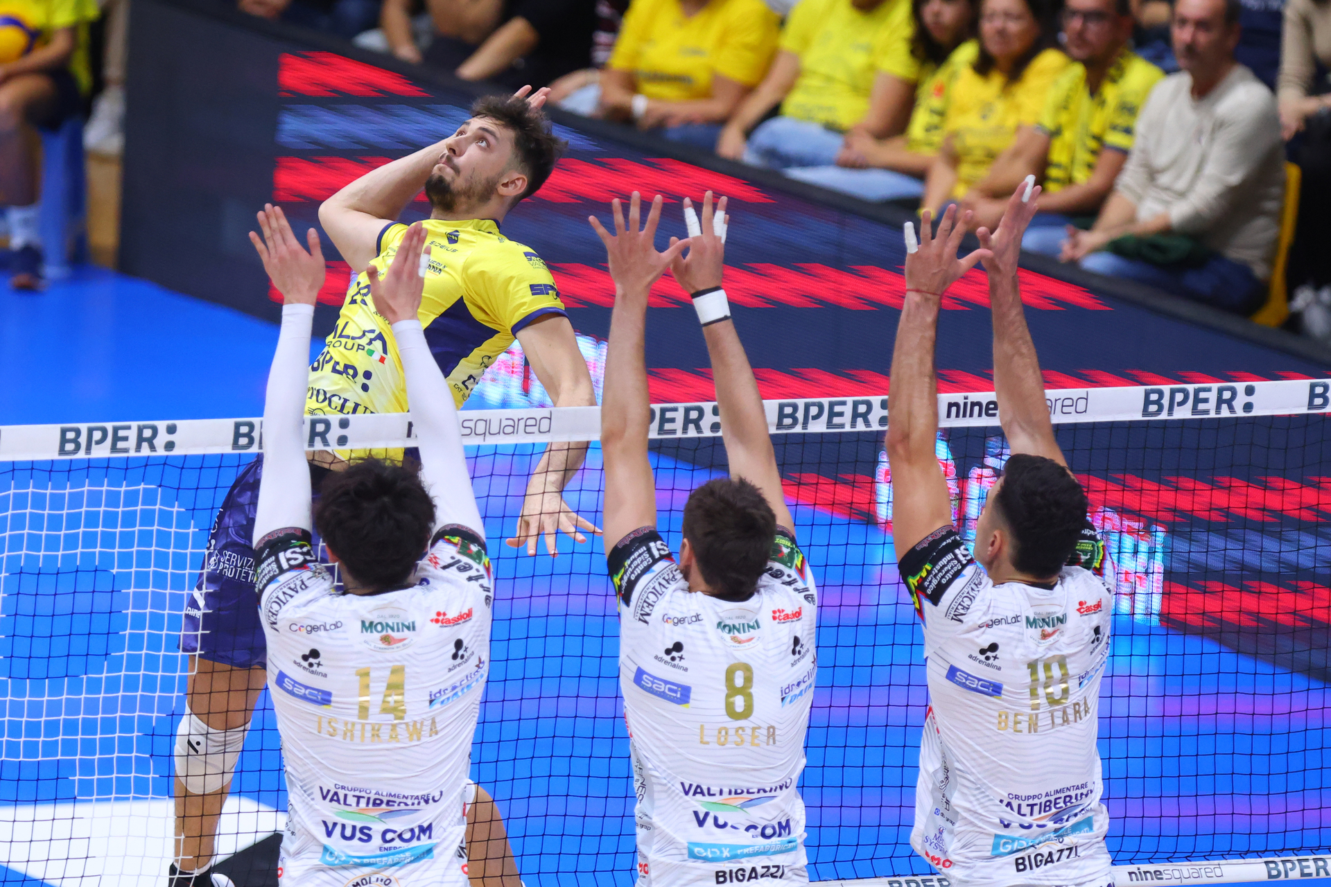 Modena parte con il sestetto composto da Tizi-Oualou-Buchegger in diagonale principale, Davyskiba-Porro di banda, Sanguinetti-Mati al centro con Perry libero. Perugia risponde con Giannelli al palleggio, Ben Tara opposto, Ishikawa-Semeniuk martelli, Loser-Russo centrali con Colaci libero. Avvio equilibrato in un PalaPanini infuocato e tutto esaurito, primo tempo di Sanguinetti e 9-9 dopo i primi scambi. Si lotta su ogni pallone, Buchegger non sbaglia e 15-14. Nel finale di parziale, Perugia alza la voce tra battuta e muro: 20-25 con mani-out di Ishikawa e 1-0 per gli umbri. Prevale l’equilibrio anche ad inizio secondo set, doppio muro gialloblù (prima Sanguinetti su Ishikawa e poi Tizi-Oualou su Semeniuk) e parità a quota 11. Modena insiste con la spinta incredibile del proprio pubblico, due ace consecutivi di Tizi-Oualou e 19-15 con timeout Lorenzetti. La squadra di Giuliani mantiene alto il livello di attenzione e concentrazione, Porro chiude il set: 25-18 e 1-1. Si gioca a ritmi alti anche nel terzo parziale: pipe di Davyskiba e 9-11. Perugia prova a scappare, sfruttando gli errori di Modena: 11-15 e timeout Giuliani. Modena non molla di un centimetro, muro di Porro su Ben Tara e 17-18. La compagine umbra risponde però presente e porta a casa il set, 20-25 e 1-2. Perugia comincia forte in avvio di quarto parziale, 3-7 dopo i primi scambi e timeout Giuliani. Gli ospiti restano avanti, ma Modena ci prova con coraggio e senza paura: due ace consecutivi di Tizi-Oualou e 13-14. Perugia sfrutta il turno in battuta di Ben Tara, ace e 16-21. Nonostante i tentativi dei padroni di casa, la squadra di Lorenzetti conduce fino al 20-25 e 1-3 finale. Modena esce comunque tra i meritati applausi del PalaPanini e tornerà in campo domenica 9 novembre (ore 18) sempre tra le mura amiche contro Sonepar Padova.