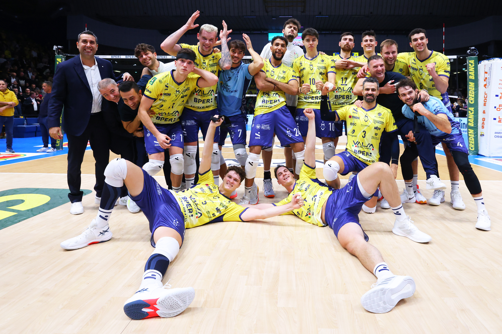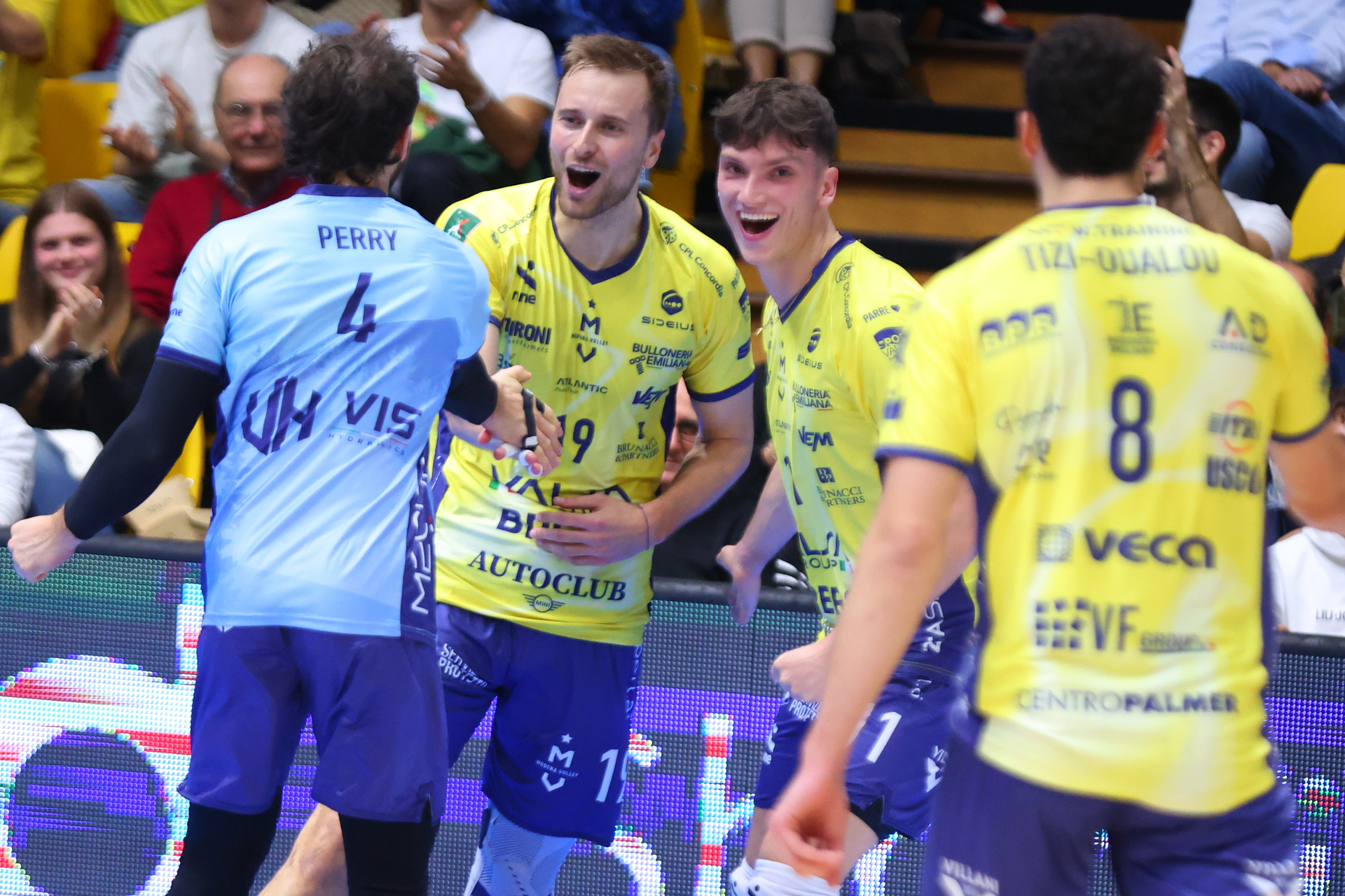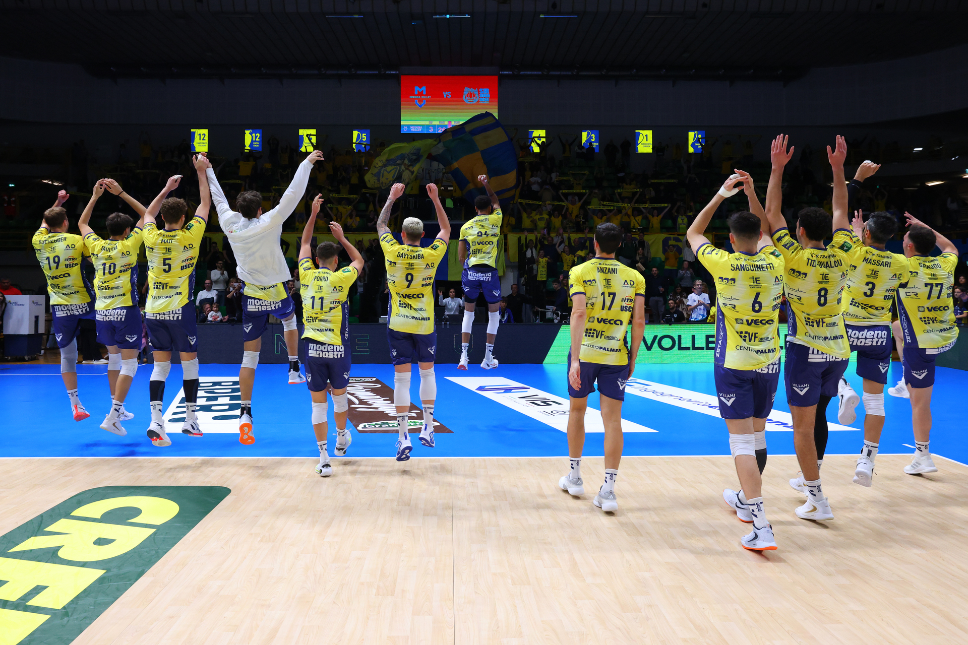 Modena parte con il sestetto composto da Tizi-Oualou-Buchegger in diagonale principale, Davyskiba-Porro di banda, Sanguinetti-Mati al centro con Perry libero. Monza risponde con Zimmermann al palleggio, Pádár opposto, Marttila-Atanasov martelli, Beretta-Mosca centrali con Scanferla libero. Avvio equilibrato e combattuto, Buchegger a segno e 13-13 dopo i primi cambi. Modena passa avanti, Anzani non sbaglia e 19-16. La formazione di Alberto Giuliani continua a spingere e porta a casa il primo set, pallonetto vincente di Mati per il 25-19 e 1-0. Modena comincia forte anche nel secondo parziale, ace di Tizi-Oualou e 7-5. I gialloblù non mollano di un centimetro e lottano su ogni pallone con grande grinta e determinazione, Davyskiba super protagonista con tre ace consecutivi e 23-15 con i padroni di casa in controllo. L’attacco di Buchegger chiude un set senza discussione, 25-17 e 2-0. Nel terzo parziale Monza prova a reagire al doppio svantaggio, ace di Atanasov e 11-15. Gli ospiti si mantengono avanti, battuta vincente di Larizza e 15-20 con timeout Giuliani. Modena risponde colpo su colpo e rientra in partita, ace di Ikhbayri per il 22-22 e parità ristabilita. Nel finale si lotta punto a punto, sono i gialloblù ad avere la meglio e a conquistare l’intera posta in palio: 26-24 e 3-0. Modena si gode la prima vittoria in campionato e tornerà subito in campo mercoledì sera (ore 20.30) a Piacenza per il primo turno infrasettimanale della stagione.