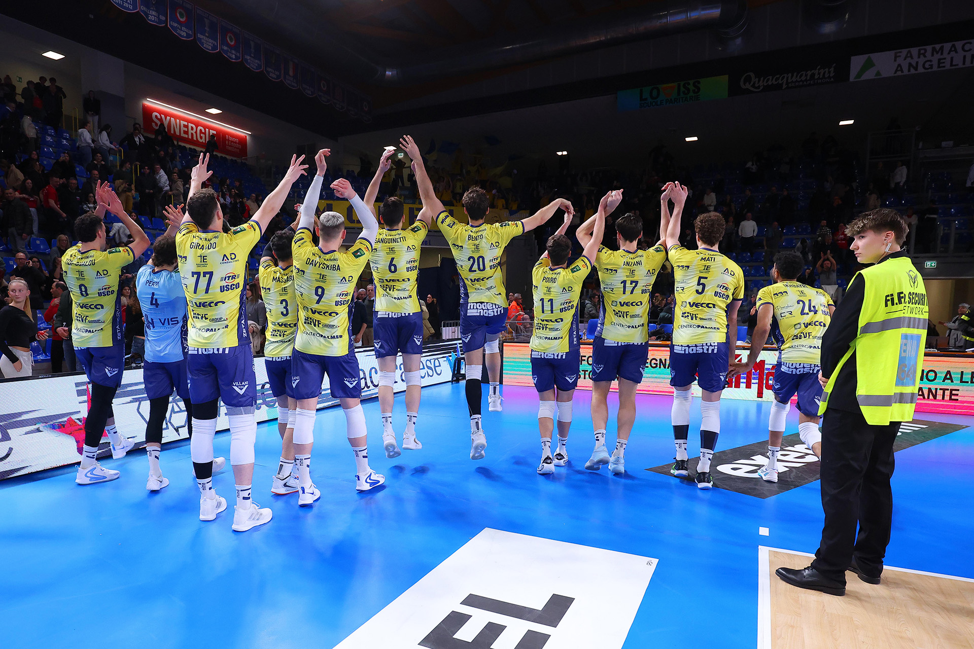 Modena parte con il sestetto composto da Tizi-Oualou-Buchegger in diagonale principale, Davyskiba-Porro di banda, Sanguinetti-Mati al centro con Perry libero. Civitanova risponde con Boninfante al palleggio, Nikolov opposto, Bottolo-Loeppky martelli, Gargiulo-Tenorio centrali con Balaso libero. I gialloblù cominciano subito forte, primo tempo di Sanguinetti e 8-10 dopo i primi scambi. La formazione di Giuliani insiste e allunga, attaccante di Porro per il 12-16 e timeout Medei. I padroni di casa provano a restare in corsa, ace di Nikolov per il 17-20 e timeout Giuliani. Il turno in battuta di Tizi-Oualou regala il primo set a Modena, 17-25 e 0-1. Avvio positivo di secondo set per i gialloblù, due ace consecutivi di Tizi-Oualou e 3-6 con la compagine ospite in controllo. Modena spinge con grande grinta e determinazione in ogni fondamentale, aumentando ulteriormente il proprio vantaggio: un altro ace di Tizi-Oualou e 10-18. Nonostante i tentativi di Civitanova, è la squadra di Giuliani a conquistare il parziale: 22-25 con punto finale di Davyskiba e 0-2. Modena non molla di un centimetro con uno scatenato Davyskiba, 9-11 e timeout Medei. Civitanova reagisce e prova a rientrare nel match, 16-14 con timeout Giuliani. I padroni di casa alzano la voce con Nikolov in battuta, primo tempo di Gargiulo e 19-14. La compagine di Medei accorcia le distanze, mani out di Loeppky per il 25-17 e 1-2. Civitanova continua a spingere al massimo, 6-2 dopo i primi scambi del quarto set e timeout Giuliani. E’ un parziale nettamente a favore di Nikolov e compagni, pipe dell’opposto bulgaro e 19-10. Si arriva fino al 25-18 con il mani out di Loeppky: 2-2 e tiebreak. Nel quinto set, si lotta punto a punto: è Modena ad avere la meglio (13-15 e 2-3) e a conquistare due punti fondamentali per morale e classifica, oltre al ritorno al successo che a Civitanova mancava da ben otto stagioni.